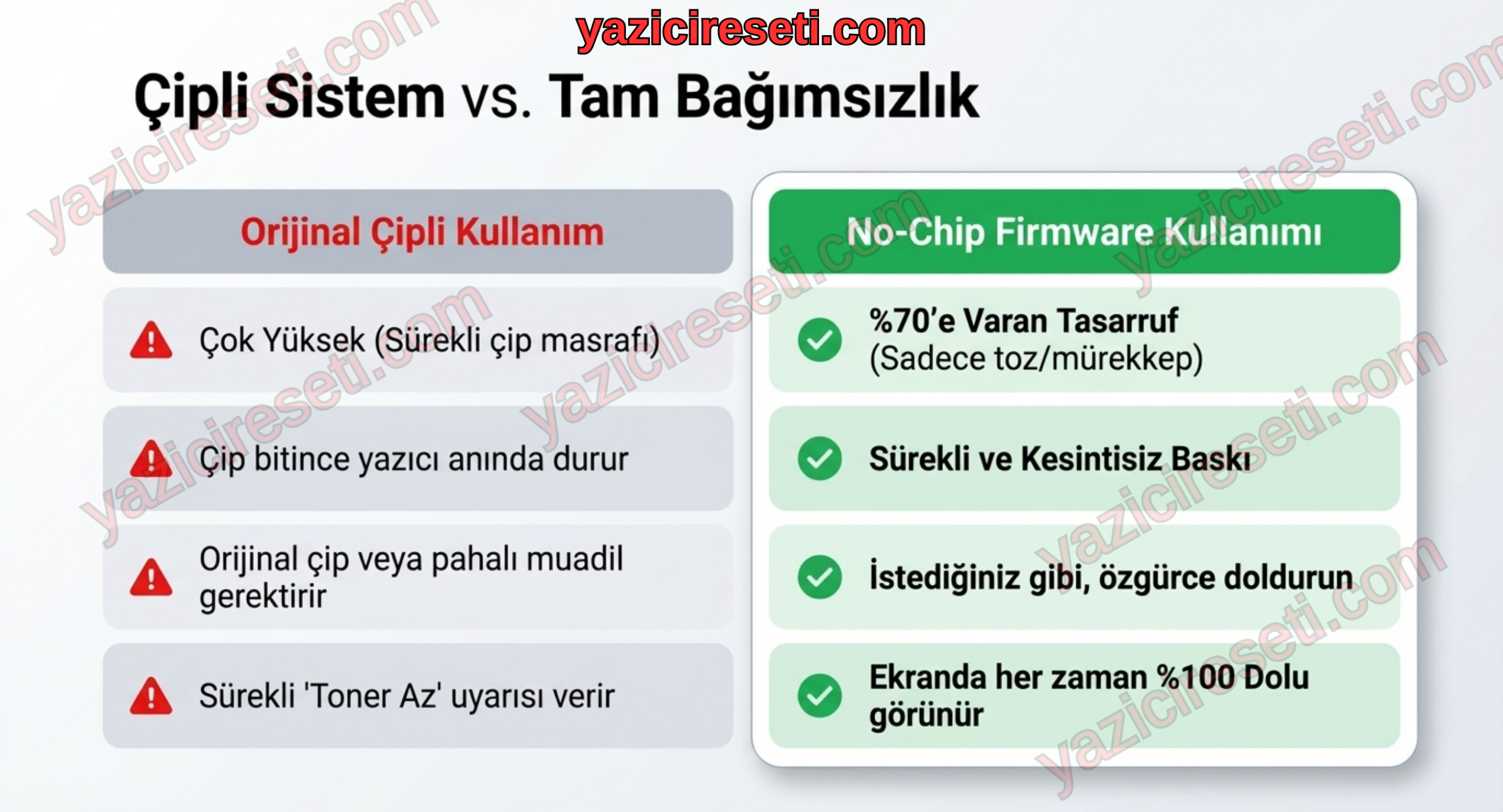Bu sayede özellikle sürekli çıktı alan kullanıcılar için baskı maliyetleri önemli ölçüde düşebilir. Toner dolumu sonrasında tekrar tekrar çip değişimiyle uğraşmak istemeyen kullanıcılar için bu yöntem daha ekonomik ve pratik bir çözüm sunar.